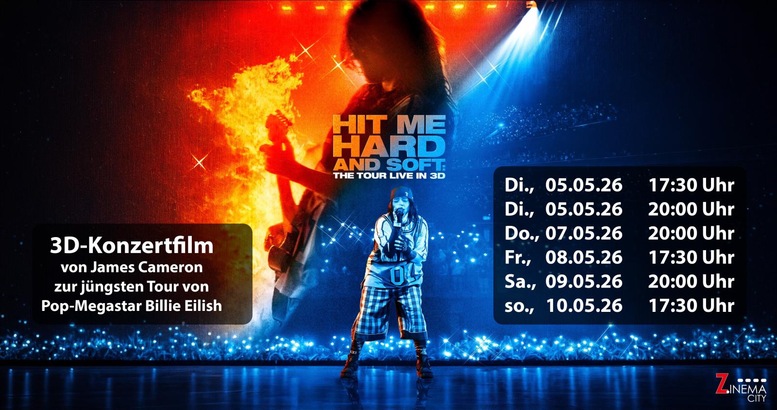 Aufgenommen während ihrer ausverkauften Welttournee, bringt BILLIE EILISH - HIT ME HARD AND SOFT: THE TOUR (LIVE IN 3D) ein innovatives neues Konzerterlebnis einer der gefeiertsten und erfolgreichsten Künstlerinnen ihrer Generation auf die große Leinwand. Der Film wird in immersivem 3D präsentiert und wurde von den Oscar®-Preisträger*innen James Cameron und Billie Eilish inszeniert. (Quelle: Verleih)